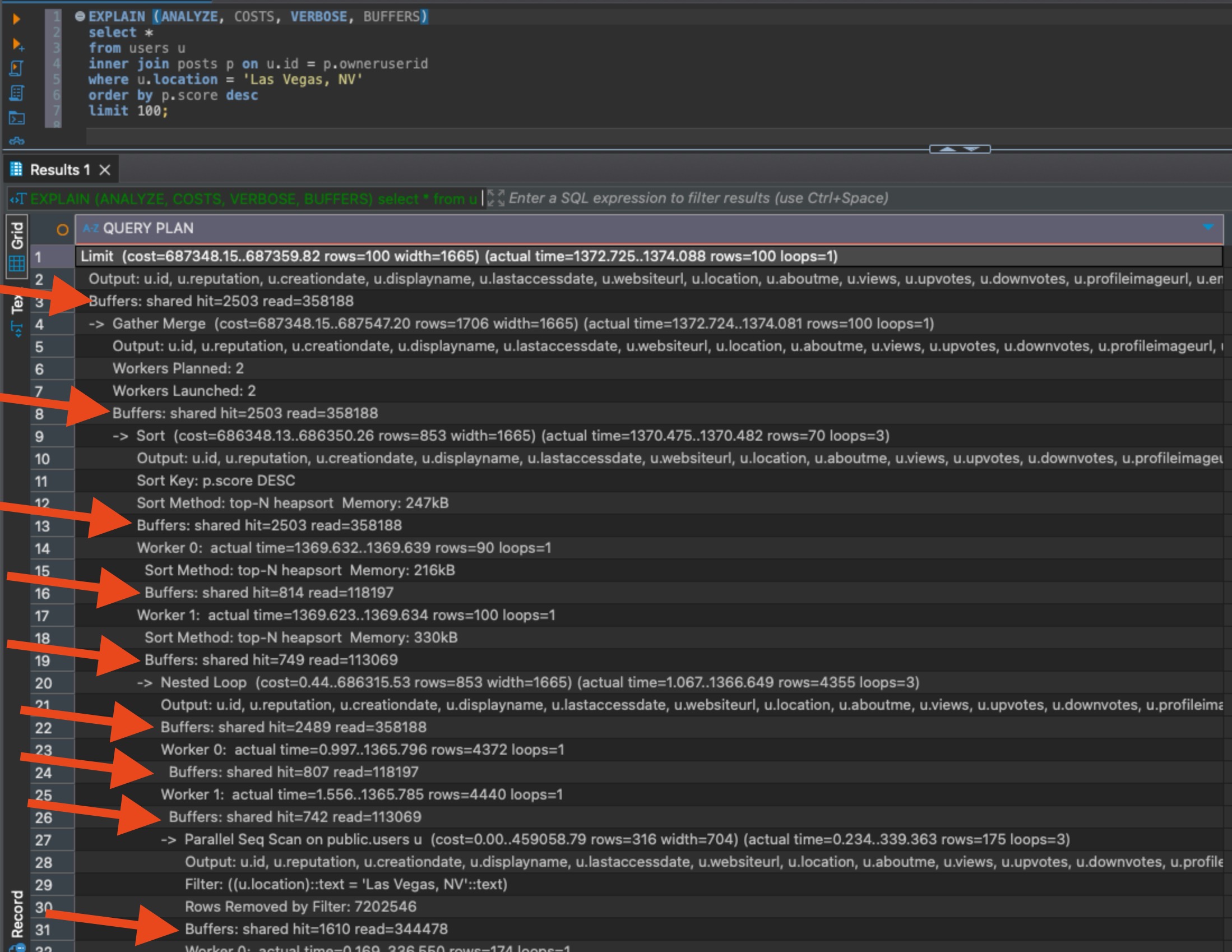 Some folks will tell you to only focus on the “read” numbers because those were much slower, since we had to get ’em from disk. However, if you re-run the same query repeatedly during tuning, you’ll notice that these numbers keep changing, and the “shared hits” number keeps going up, and the “read” keeps going down. That’s because the more you’re running the same query over and over, the more likely it is that your data is still going to be fresh in cache.