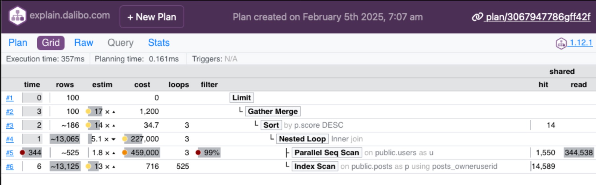 In that above example, I pasted the plan in and clicked the Grid button at the top left, and then looked at the Shared numbers on the right side. The operation with the biggest numbers is the one doing the most reads, and if you’re tuning to reduce storage reads, that’d be the table to look at. In this case, my operation on “public.users” is doing a scan, meaning that table may need an index.