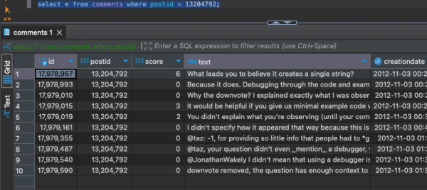 Which does indeed produce 10 rows, matching the commentcount = 10 value in the above screenshot: